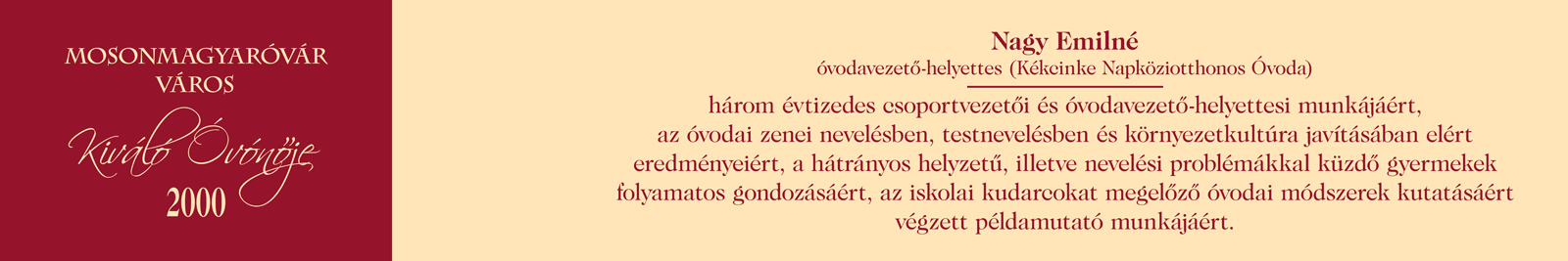 A díjazottak nyilvántartásában feltüntetett intézményneveket a díj átadásakor hatályos nevekként tüntettük fel, helyesírásuk az abban az időben hatályos szabályok szerint lett rögzítve! Amennyiben ezzel kapcsolatban észrevételük lenne, kérjük, legyenek kedvesek azt a titkarsag@mosonmagyarovar.hu e-mail címre közvetlenül megküldeni!