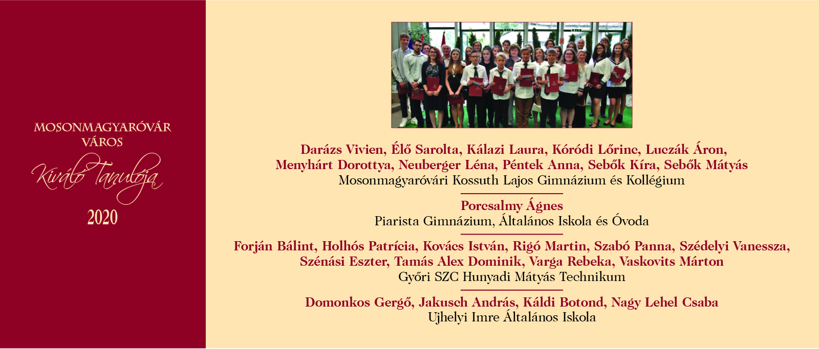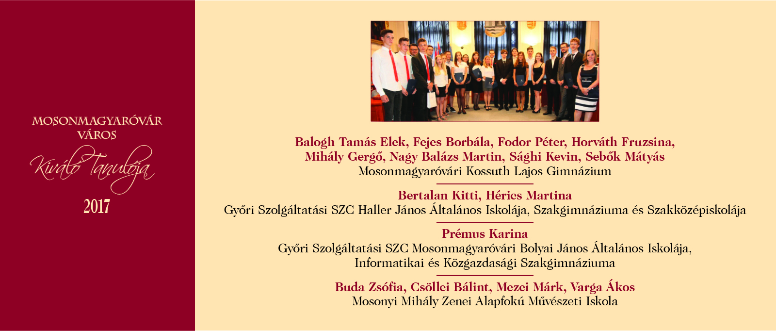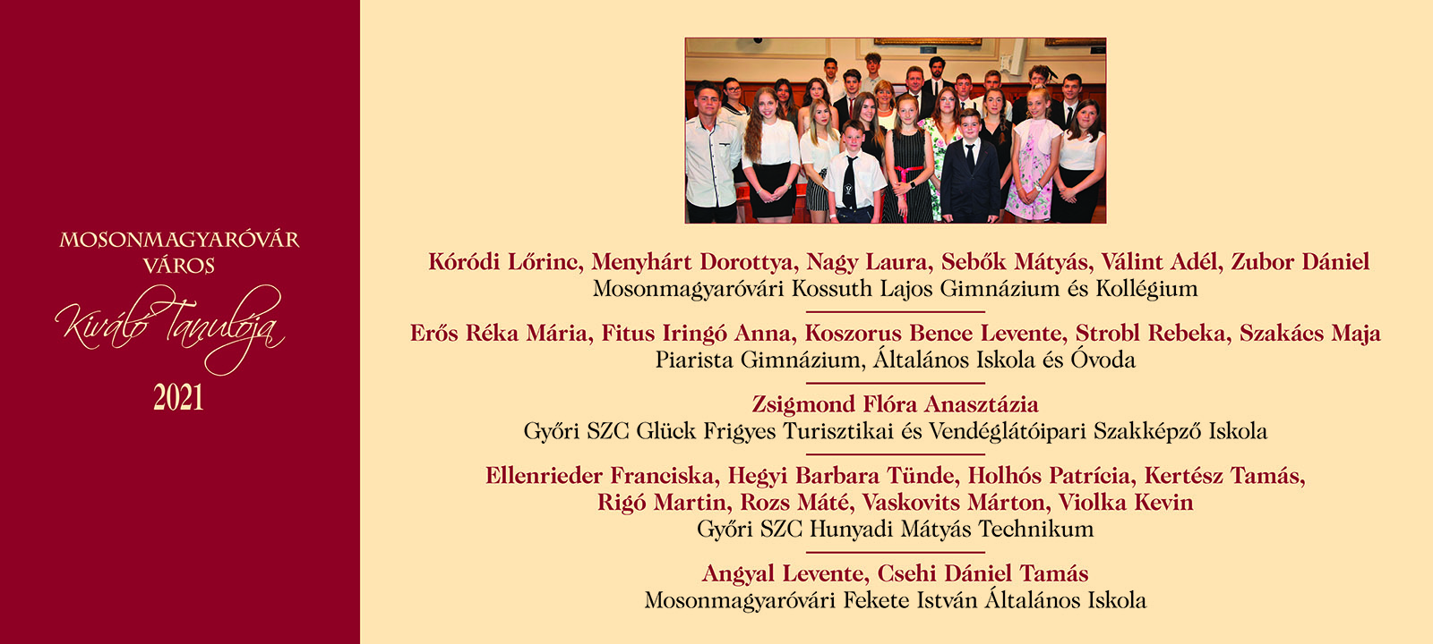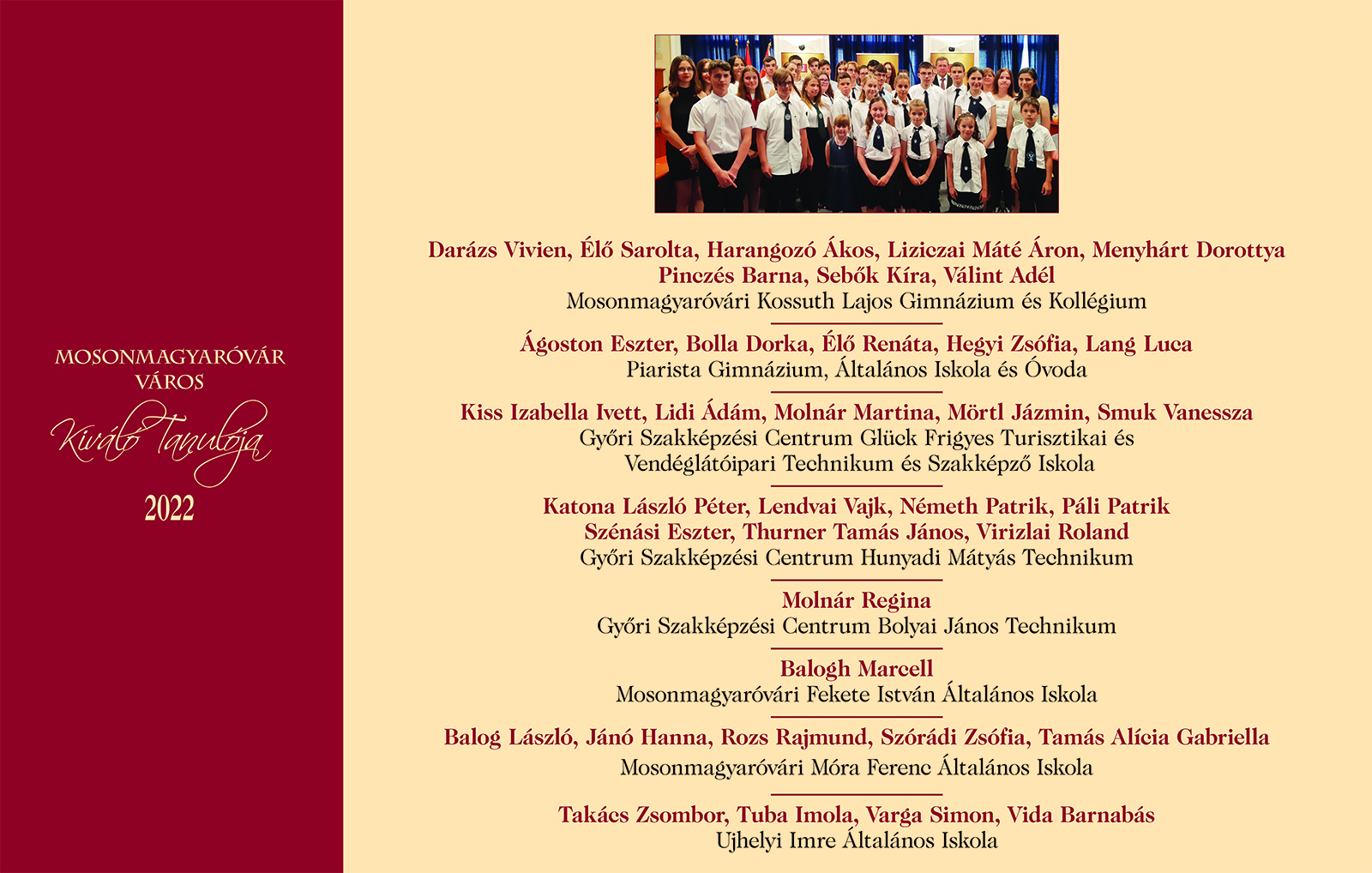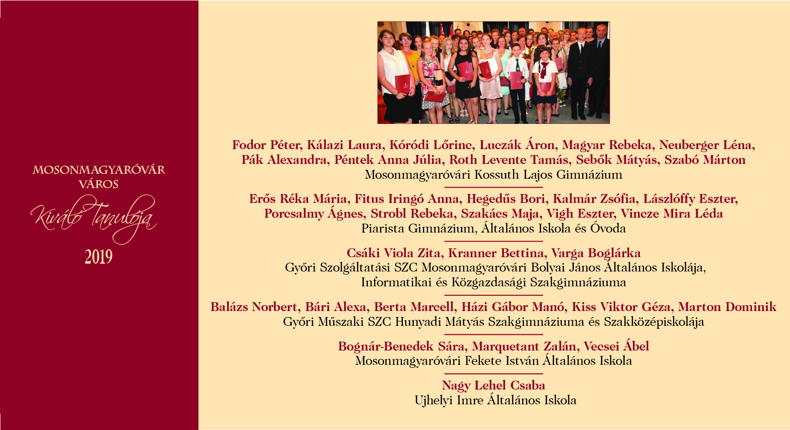 A kiváló tanulmányi, művészi többletteljesítményével iskolája és városunk hírnevét öregbítő mosonmagyaróvári iskolába járó tanulók elismerése.