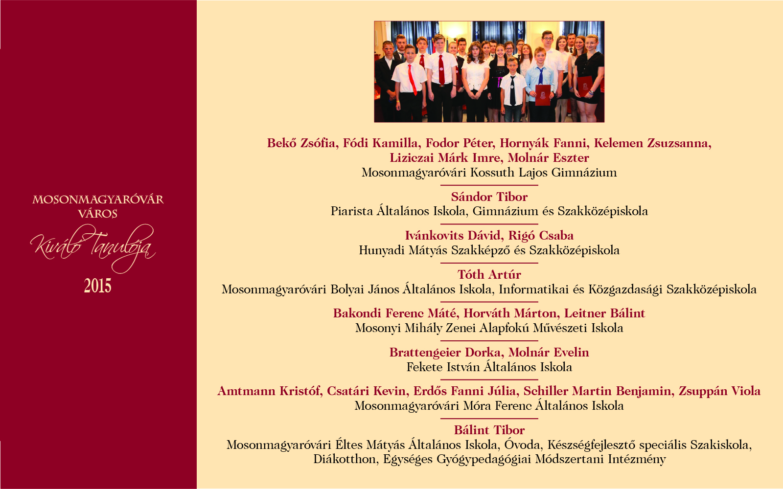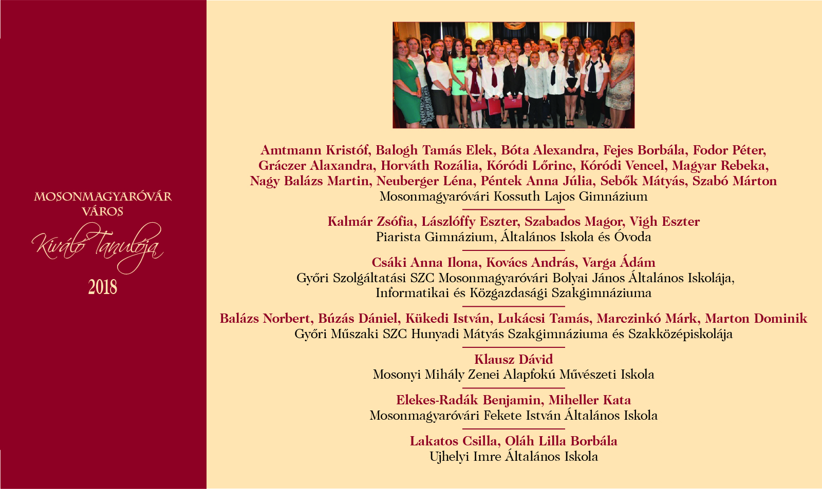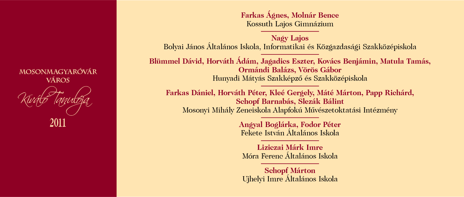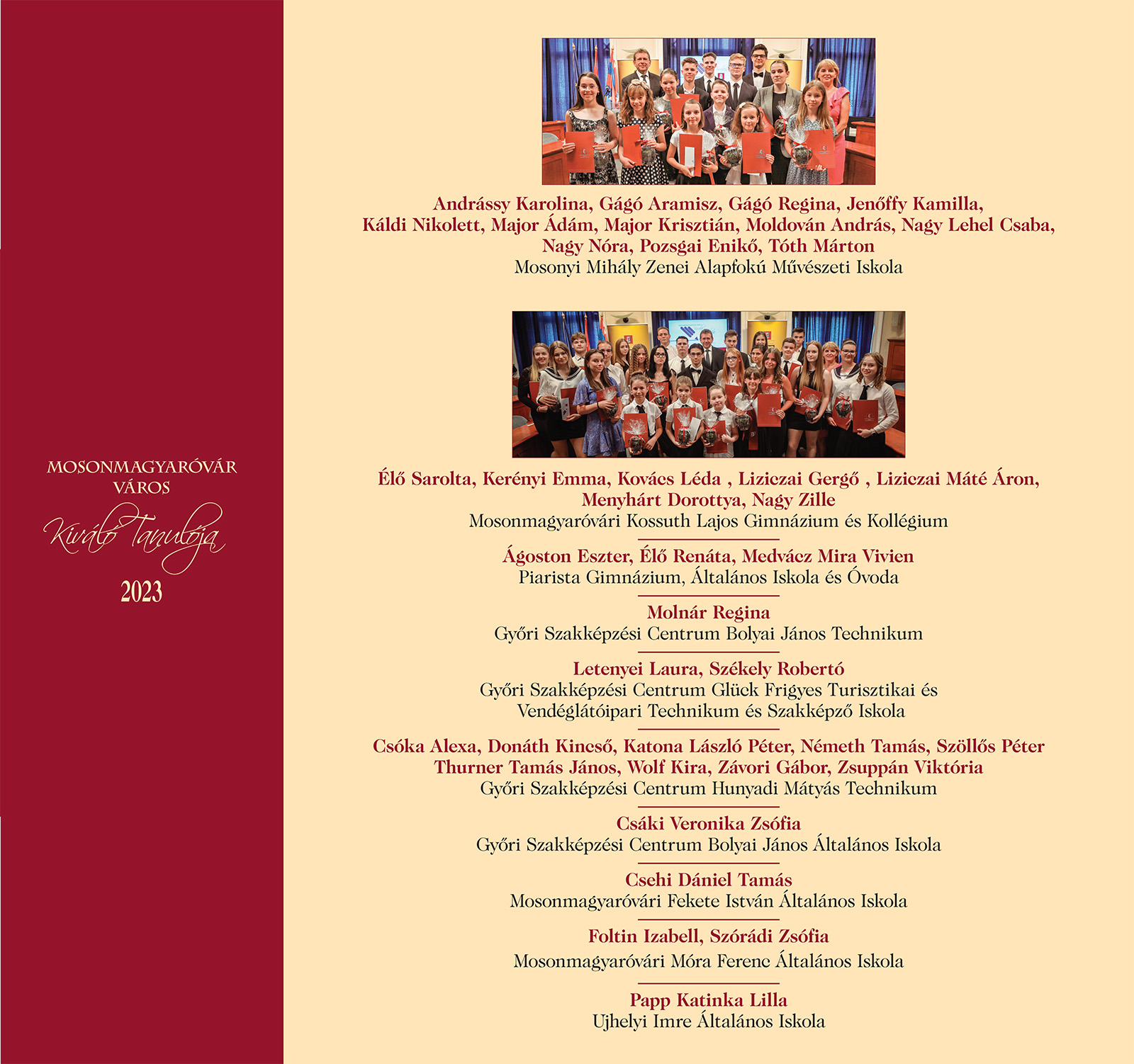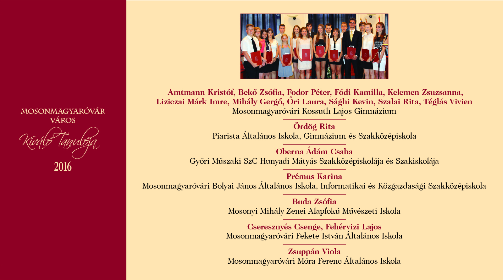 A kiváló tanulmányi, művészi többletteljesítményével iskolája és városunk hírnevét öregbítő mosonmagyaróvári iskolába járó tanulók elismerése.